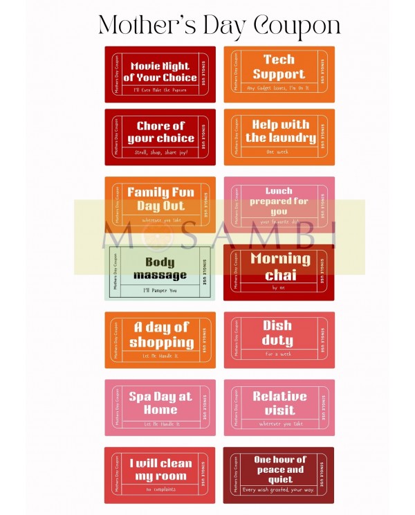 Celebrate the special bond you share with your mother with our heartfelt Mother's Day Coupons. Each coupon is a token of appreciation, offering your mom the gift of love and cherished memories. From acts of kindness to quality time together, these coupons are a thoughtful way to show your gratitude and make her feel truly loved.
